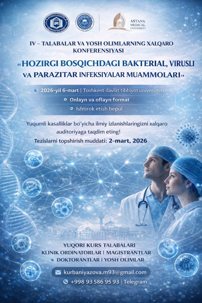 🌍 IV – TALABALAR VA YOSH OLIMLARNING XALQARO KONFERENSIYASI «HOZIRGI BOSQICHDAGI BAKTERIAL, VIRUSLI VA PARAZITAR INFEKSIYALAR MUAMMOLARI»